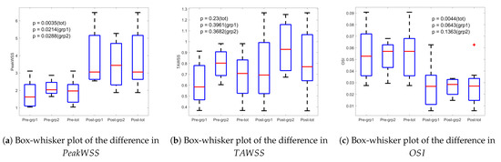 , like , shows a significant difference between pre- and post-operative cases (), suggesting both metrics may serve as effective parameters for perioperative assessment of the aortic valve. Additionally, Figure 6a illustrates that the change in is more pronounced in Group 1 compared to Group 2, indicating a greater capacity for restoring normal hemodynamics and tissue biomechanics through valve repair in dysfunctional valves, compared to valve-sparing root replacement in already well-functioning valves. The observed hemodynamic normalization following VSRR reinforces a mechanical association between altered and structural remodeling of the aortic valve [18,19].
