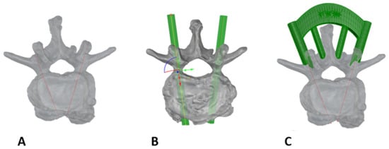Individual drilling templates for the respective vertebrae were then designed using the above-mentioned CAD software and 3D printed using the Polyjet printing process (Stratasys J850 DAP, Stratasys Inc., Minnetonka, MN, USA) from VeroPureWhite material. After determining the entry points, the traditional trajectory along the pedicle was defined (see Figure 2A), and the appropriate screw diameter was selected, which is represented as a cylinder in the software (see Figure 2B). This was followed by the aforementioned parallel displacement of the correct screw position in the desired direction, using the predefined offset (1). Connecting elements and supports were then designed onto the drilling templates to ensure secure placement on the vertebra (Figure 2C). The templates were printed.