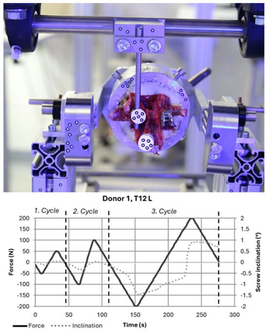 The load application was executed as a quasi-static test consisting of compressive and tensile loads in the craniocaudal direction. These loads were applied with 5 N/s to the pedicle screw via the implant rod in three cycles. The target force values increased gradually, reaching ±50 N (first cycle), ±100 N (second cycle), and ±200 N (third cycle) (Figure 3). In the event of significant loosening of the screws during compression loading, a risk of collision was identified due to the compact design of the test setup. This was prevented by premature manual shutdown. The following exclusion criteria were defined for data evaluation:
