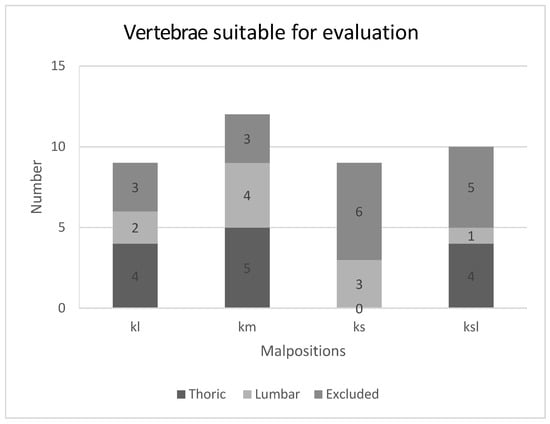 Distribution of suitable vertebrae for data evaluation grouped into each malpositioning (lateral—l; medial—m; superior—s; superior-lateral—sl).