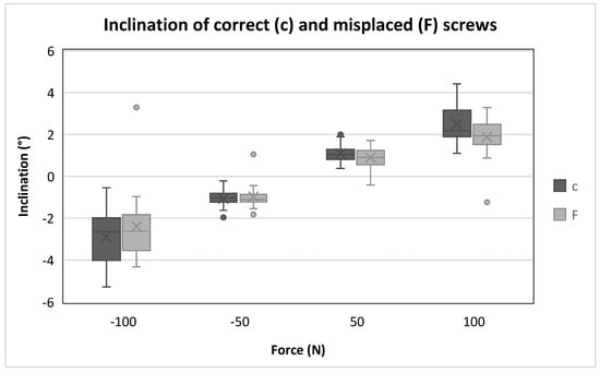 The Wilcoxon test showed that there were only significant differences between correctly and incorrectly positioned screws at a tensile load of 100 N (Table 2). The said difference in inclination at 100 N is approximately 2° (Figure 5). The box plots indicate increasing dispersion of the inclination with increasing loads (Figure 5), but no differences between the groups are apparent.