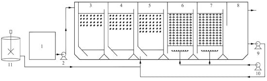 Schematic diagram of the experimental setup: (1) influent tank; (2) lift pump; (3) Anaerobic Zone 1; (4) Anaerobic Zone 2; (5) Anoxic Zone; (6) Aerobic Zone 1; (7) Aerobic Zone 2; (8) sedimentation zone; (9) recirculation pump; (10) aeration pump; (11) chemical dosing tank.