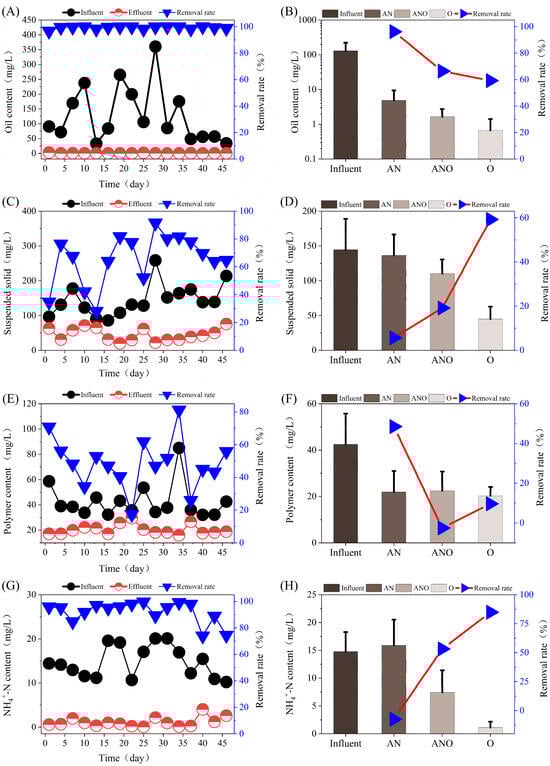 Removal performance of oil content, SS, and polymers in the Fe3+-augmented composite bioreactor: (A) overall oil content removal; (B) oil content removal across treatment units; (C) overall SS removal; (D) SS removal across treatment units; (E) overall polymer removal; (F) polymer removal across treatment units; (G) overall NH4+-N removal; (H) NH4+-N removal across treatment units.