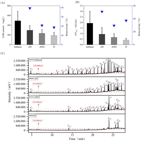 Organic matter removal performance: (A) COD removal; (B) UV254 reduction; (C) GC-MS spectrum of organic pollutants.