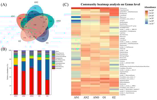 The bacterial diversity indices of all samples are summarized in Table 2. Sequencing coverage for each of the six samples exceeded 99.9%, affirming the comprehensiveness and representative quality of the community profiling. As shown in Figure 4A, a total of 310 operational taxonomic units (OTUs) were commonly observed across all bioreactor zones, with Anaerobic Zone 1 (AN1) exhibiting the highest number of unique OTUs. The elevated bacterial diversity not only enhanced the system’s capacity for the degradation of a broad range of pollutants but also improved its resilience and adaptability to toxic and high-strength contaminant shocks. A progressive decline in the relative abundance of Firmicutes and Chloroflexi was observed from anaerobic through anoxic to aerobic stages, accompanied by a marked enrichment of Proteobacteria (Figure 4B). The relative abundances of Proteobacteria across bioreactor compartments were 3.13% (AN1), 22.25% (AN2), 20.76% (ANO), 24.23% (O1), and 45.62% (O2), respectively. This distribution pattern suggested that Proteobacteria not only persisted through all stages but that their abundance was positively correlated with increased dissolved oxygen concentrations, culminating in their dominance in Aerobic Zone 2. The eventual predominance of Proteobacteria could be ascribed to their exceptional metabolic flexibility and ecological adaptability, which enable them to exploit a broad spectrum of organic substrates and efficiently perform aerobic metabolic processes. Additionally, many members of the Proteobacteria phylum are known to play key roles in nutrient cycling, including ammonia oxidation and denitrification, further supporting their competitive advantage under aerobic conditions [].