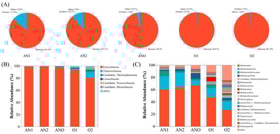 Archaeal community composition: (A) archaeal distribution; (B) phylum level; (C) genus level.