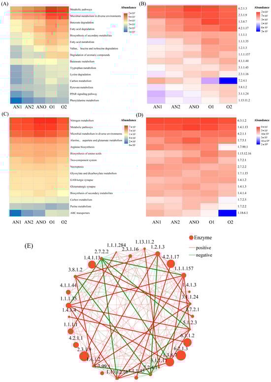Degradation pathways and key enzymes for PHs and nitrogenous pollutants: (A) top 15 KEGG pathways (Level 3) involved in PH degradation; (B) top 15 enzymes involved in PH degradation; (C) top 15 KEGG pathways (Level 3) involved in nitrogen cycling; (D) top 15 enzymes involved in nitrogen cycling; (E) co-occurrence network of the top 30 enzymes based on abundance.