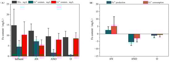 Variations in total iron, Fe3+, and Fe2+ concentrations: (A) concentration profiles of total iron, Fe3+, and Fe2+ across bioreactor compartments; (B) Fe3+ consumption and Fe2+ production.