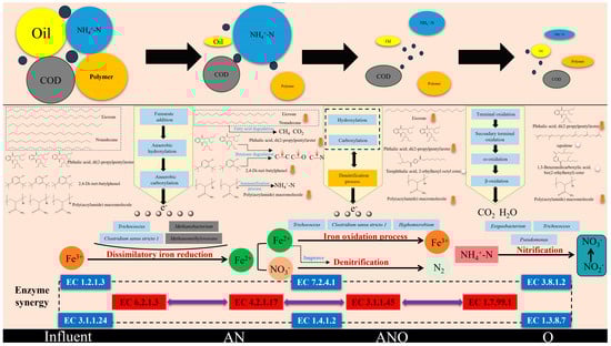Based on the integrated analysis of Fe3+/Fe2+ redox transformation and contaminant degradation (Figure 2), a comprehensive model of Fe3+-mediated synergistic degradation pathways was proposed (Figure 8). Under Fe3+ supplementation, synergistic interactions between FeRB (including Trichococcus, Bacillus, and Clostridium sensu stricto 1) and methanogenic archaea (including Methanothrix, Methanobacterium, and Methanomethylovorans) markedly facilitated the oxidation of organic contaminants. The underlying mechanisms involved dissimilatory iron reduction, maleate addition, anaerobic hydroxylation, and carboxylation processes [,,]. Within the anaerobic compartments, the breakdown of long-chain alkanes, aromatic hydrocarbons, and polyacrylamides was facilitated by the cleavage of C–C, C–O, and C–N bonds through metabolic pathways such as long-chain fatty acid degradation, benzoate catabolism, and ammonification. Fe3+ reduction (Fe3+ + e− → Fe2+) and amine dealkylation (R–NH2 → NH4+-N) were identified as the predominant reactions, jointly mediating the degradation of recalcitrant organic compounds. Microbial oxidation of organic substrates provided a continuous electron flow that enabled the simultaneous degradation of contaminants and biological nitrogen removal. In chemical-flooding-produced water, organic pollutants such as residual petroleum hydrocarbons and polymers act as primary electron donors. These substrates underwent progressive oxidation by hydrolytic-acidifying microorganisms, iron-reducing bacteria (FeRB), and denitrifying bacteria, during which electrons were released. These electrons served as reducing equivalents that enabled the parallel reduction of Fe3+ to Fe2+ and the stepwise reduction of nitrate and nitrite during denitrification. In the aerobic compartments, residual organic compounds underwent further transformation through mono-terminal oxidation, di-terminal oxidation, sub-terminal oxidation, ω-oxidation, and β-oxidation, while concurrent nitrification ensured a sustained supply of NO3−, reinforcing denitrification and contaminant removal in the anoxic environment. Under Fe3+-enriched conditions, the collective action of multiple bioactive enzymes played a decisive role in the bioconversion of organic pollutants in produced water. Notably, auxiliary enzymes (e.g., EC 1.2.1.3, EC 7.2.4.1, EC 3.8.1.2, EC 3.1.1.2, and EC 1.4.1.2) enhanced the catalytic activity of primary degradative enzymes (EC 6.2.1.3, EC 4.2.1.17, EC 3.1.1.45, and EC 1.7.99.1), collectively driving the bio-oxidation and mineralization of complex organics.