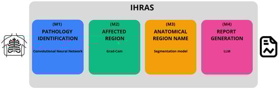 However, the system’s performance is currently constrained by limitations, including the modest F1-score in the multi-label classification task, which likely arises from the imbalanced data problem, and the lack of evaluation of the Grad-CAM. Hence, as future work, these modules of the IHRAS architecture should be further studied, with the aim of improving its performance, including clinician-based evaluations of the complete system. Future works should also investigate the use of the proposed architecture in other medical imaging applications, such as Computed Tomography scans, Magnetic Resonance Imaging, and ultrasound, or to other anatomical regions beyond the thorax.