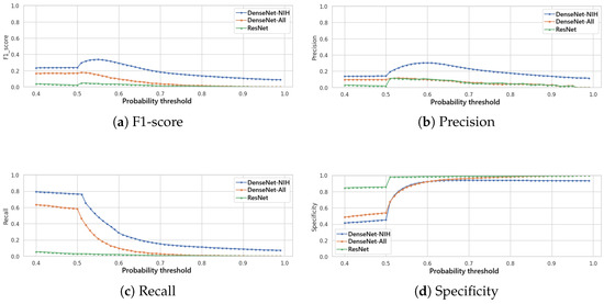 Figure 2d) in function to the variation of this threshold for the three classification models. It is noted that the DenseNet trained specifically for the NIH dataset achieves the best F1-score, precision and recall for a given threshold, and, thus, this model is selected for the classification module of IHRAS in this work.