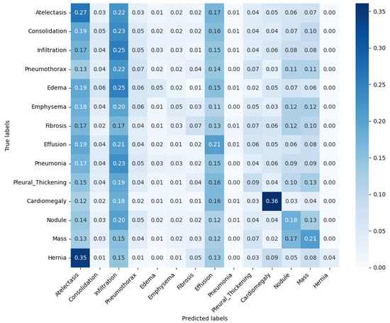 Figure 3 presents the normalized confusion matrix of the classification model, in which rows represent the true labels, while columns show predicted classifications. It indicates that the model tends to predict a CXR as atelectasis, infiltration and/or effusion, whilst labels such as pneumonia and hernia are more rarely predicted. This behavior possibly explains the modest F1-score obtained.
