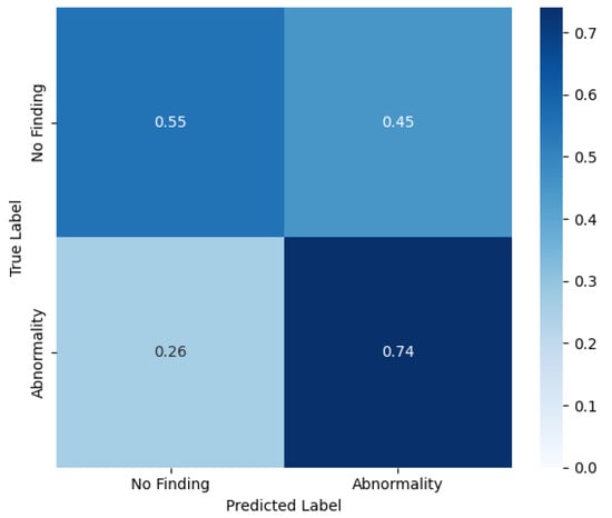 Although IHRAS is designed to identify and differentiate between several thoracic pathologies, we also evaluate its performance in a binary classification task distinguishing between abnormal and normal chest X-rays. In this binary setting, all images exhibiting at least one pathological finding, regardless of the specific diagnosis, are grouped under the abnormal class, whereas those explicitly labeled as no findings constitute the normal class. This evaluation enables the assessment of the model’s capability to serve as a general screening tool, flagging potentially abnormal cases for further review. It also provides insight into the system’s general sensitivity to pathological signals irrespective of specific diagnoses.