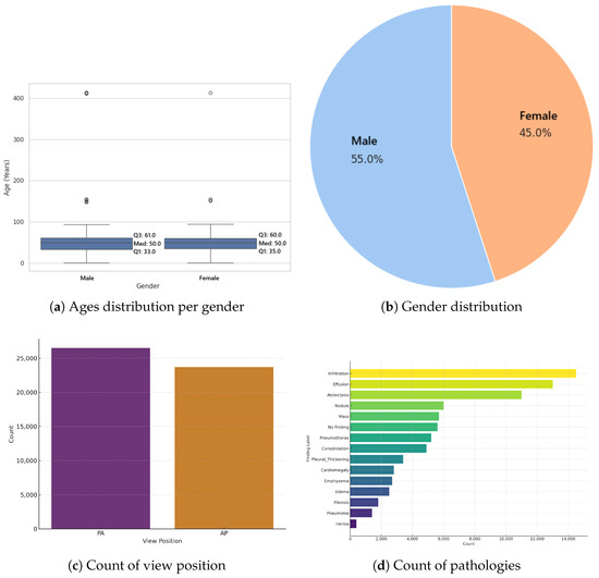 Figure 5d show that the imbalance for the pathologies count is significantly greater, thus suggesting the long-tailed characteristics of the dataset. However, since this section focuses on assessing a pretrained model’s diagnostic performance across diverse subgroups, rather than training a new model, such imbalances reflect clinical variability rather than methodological limitations.