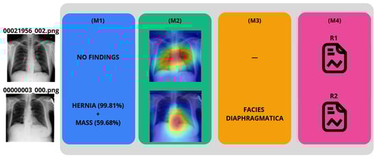 Section 3.3, localize the regions influencing the classification model’s decision and map them to their corresponding anatomical terms, respectively. Finally, M4 integrates the outputs from M1 and M3, using an LLM to generate the medical report, as discussed in