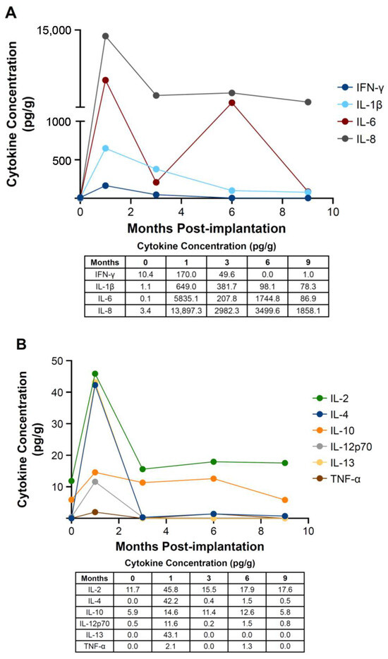 Several pro-inflammatory tissue cytokines, including IFN-γ, IL-1β, IL-6, and IL-8, peaked at 1 month post-implantation, reaching concentrations of 170.0 pc/g, 649.0 pg/g, 5835.1 pg/g, and 13,897.3 pg/g, respectively (Figure 1A). Increases in other cytokines, including IL-2, IL-4, IL-10, IL-12p70, IL-13, and TNF-α, also were detected, although the increases were not substantial, with concentrations below 100 pg/g, at 1 month post-implantation (Figure 1B). Most cytokine concentrations either plateaued or subsided to near-baseline levels (pre-implantation) by 3 to 9 months.