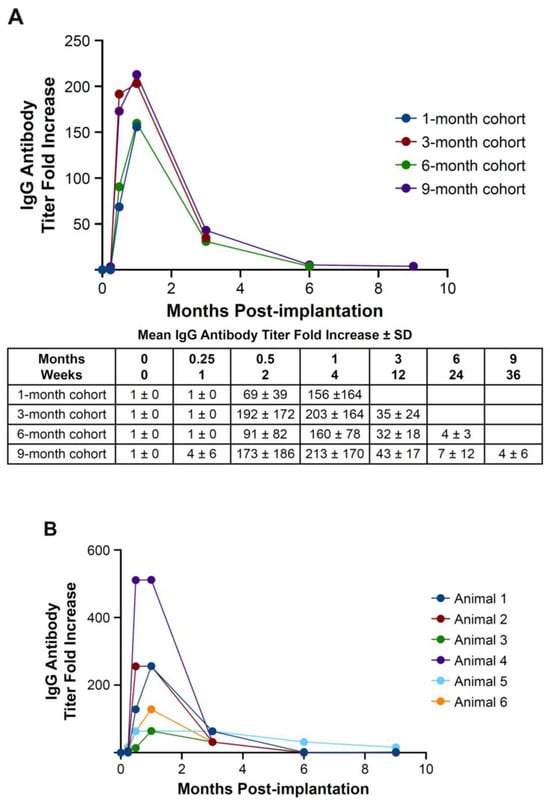 E-PADM-specific serum IgG antibody titer peaked 1 month post-implantation with an average 183-fold increase from baseline (range, 156–213-fold increase across all cohorts; Figure 2A,B). At 3 months post-implantation, IgG antibody titer decreased to an average 36.4-fold difference from baseline (range, 32–43), then subsided to <10-fold difference from baseline by 6 and 9 months.