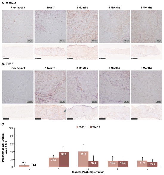 MMP-1-positive tissue area peaked at 3 months post-implantation, then decreased and stabilized by 6 months, while TIMP-1-positive tissue area peaked at 1 month post-implantation, then decreased and stabilized by 9 months. Representative high- (100×; scale bars, 100 µm) and low-(10×; scale bars, 1 mm) magnification images of (A) MMP-1 and (B) TIMP-1 from sample tissues collected pre-implantation and 1, 3, 6, and 9 months post-implantation. There was a higher abundance of MMP-1- and TIMP-1-positive tissue area at 3 months and 1 month post-implantation, respectively, compared with pre-implantation. (C) Mean percentage ± SD of MMP-1- and TIMP-1-positive areas. n = 6 animals/time point. MMP-1, matrix metalloproteinase 1; SD, standard deviation; TIMP-1, tissue inhibitor matrix metalloproteinase 1.