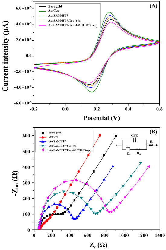 Cyclic voltammetry (CV) is a very powerful tool for probing the features of a modified electrode surface, providing a rapid and straightforward method for preliminary characterization of the modified electrode using a redox couple system [32]. The CV was performed over a potential range from −0.2 V to 0.6 V with a scan rate of 100 mVs−1 in a solution containing 5 mM Fe(CN)63−/4−, prepared in 10 mM PBS (pH 7.4). As shown in Figure 1A, progressive changes in both the redox peak positions and current responses were observed as the gold electrode underwent sequential surface modifications, indicating alterations in electron transfer characteristics of the redox probe. At the initial stage, the bare gold electrode displayed well-defined and reversible redox peaks with a peak-to-peak separation (ΔEp) of approximately 80 ± 5 mV (Figure 1A, black curve), consistent with a previous study that correlates this behavior with clean and electrochemically active gold surfaces [32]. The formal potential of the redox couple was estimated to be approximately 0.21 V, derived from the mean of anodic and cathodic peak potentials in the cyclic voltammogram of the bare gold electrode. A gold electrode was chemically modified with a monolayer of cysteamine using the well-established gold-thiol (Au-S) chemistry. This led to the formation of NH2 groups on the surface of the cysteamine-modified gold electrode. The positively charged amine groups, with a surface pKa of 7.6, were found to be responsible for the electrostatic attraction of the negatively charged redox probe [42]. Consequently, this interaction enabled an enhancement of the interfacial electron-transfer process, yielding a slight increase in peak current and a reduction in peak-to-peak separation to 60 ± 3 mV (Figure 1A, green curve). Following the activation of the amino groups using the PDICT cross-linker, the immobilization of the HT7 antibodies, and the blocking of the surface with ethanolamine, the shape of the CV exhibited a slight alteration, characterized by a reduction in the peak current and an increase in the peak-to-peak separation (Figure 1A, blue curve). This is consistent with the increased electron transfer barriers generated by the assembly of these layers. Specifically, after the antibody is immobilized onto the modified electrode, a significant peak-to-peak separation is observed. This indicates that the immobilization of the antibody insulates the electrode due to its large-size analyte (150 kDa) and being negatively charged (pI 4.65) at the working pH [43], which notably disrupts the interfacial electron transfer.