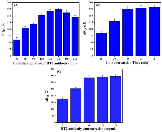 Optimization of (A) the immobilization time of HT7 antibody, (B) the immunoreaction time, and (C) the BT2 antibody concentration, using 10 ng/mL of antigen in 10 mM PBS solution in the presence of 5 mM Fe(CN)63−/4− at pH 7.4.