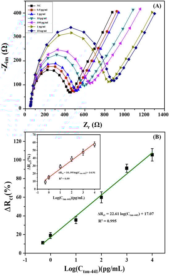 (A) Nyquist diagram (Zr vs. Zim) for sandwich-based immunosensor in the presence of the Tau-441 under a range from 0.5 pg/mL to 10 ng/mL in a 10 mM PBS solution in the presence of 5 mM Fe(CN)63−/4− at pH 7.4. (B) The calibration plot related to the increase of relative electron-transfer resistance (∆Rct (%)) of the sandwich-based immunosensor with different Tau-441 concentrations in PBS, respectively. The inset is the calibration curve of the direct immunosensor. Error bars reveal the standard deviation of three distinct repetitive measurements.