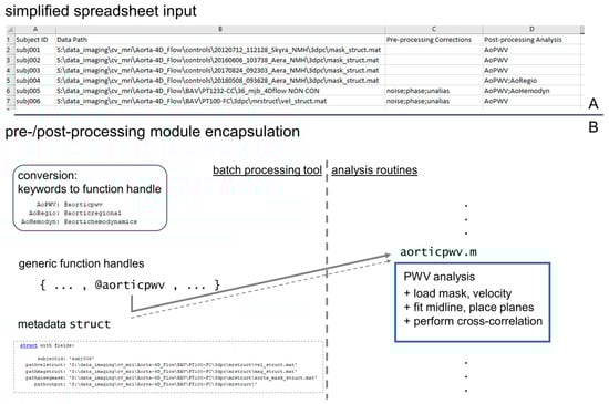 Input specification and module structure for processing tool. A simplified spreadsheet input (A) is used to specify datasets to be processed by the pipeline tool, and its creation constitutes the only user interaction needed. The spreadsheet contains columns identifying a dataset (“Subject ID” and “Data Path”) and specifying pre- and post-processing operations that are required for the dataset. For the execution of the processing steps, all pre- and post-processing modules are encapsulated with a uniform function header to allow for generic handling by the pipeline tool, which parses the spreadsheet and creates a queue of processing steps to complete (B).