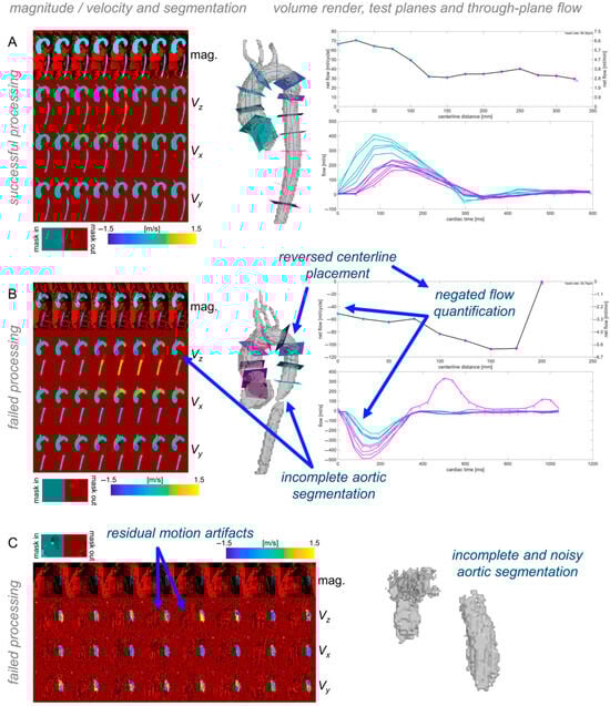 Quality check outputs. Each dataset’s quality check outputs show overlays of the aortic segmentation with magnitude and velocity images, and volume renderings of the segmentation with centerlines and through-plane flow along the length of the segmentation. Examples of successful processing (A) and different types of failed processing (B,C) illustrate how the quality check outputs can be used to quickly validate automated processing results.