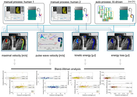 Comparison scheme for evaluating inter-observer reliability with manual or automated processing. Hemodynamic parameter quantifications for global aortic pulse wave velocity and regional aortic maximal velocity, kinetic energy, and energy loss, all derived from two sets of manual processing, were compared against each other and against the values derived from fully automated processing. The fully automated processing was performed twice to demonstrate the stability of quantification results.