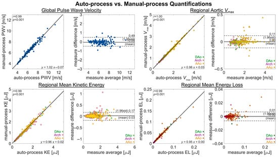 Measurement agreement for auto- and manual-processing quantifications. An assessment of measurement agreement, comparing quantifications from fully manual processing against those of fully automated processing for metrics of PWV, Vmax, KE, and EL. The quantification of PWV is a global aortic metric, with one value per subject. The quantifications of Vmax, KE, and EL are as regional metrics (AAo, arch, DAo), with three values per subject.
