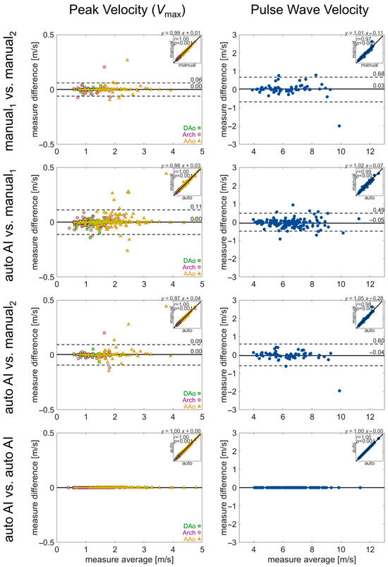 Evaluation of inter-observer reliability in manual and automated quantifications. Bland–Altman analysis for regional aortic volume-averaged pulse wave velocity and peak velocity. Solid lines show bias (mean difference) and dashed lines show limits of agreement (1.96 standard deviation difference). The insets in each plot show the correlation between the two quantifications, with the correlation coefficient and linear fit annotated. Values for the quantification in each aortic region (AAo, arch, DAo) are noted by a green square, purple circle, or yellow triangle, respectively.