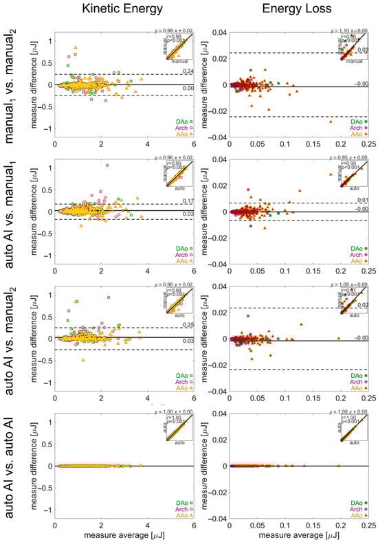 Evaluation of inter-observer reliability in manual and automated quantifications. Bland–Altman analysis for aortic kinetic energy and energy loss. The solid lines show bias (mean difference) and the dashed lines show limits of agreement (1.96 standard deviation difference). The insets in each plot show the correlation between the two quantifications, with the correlation coefficient and linear fit annotated. Values for the quantification in each aortic region (AAo, arch, DAo) are noted by a green square, purple circle, or yellow triangle, respectively.