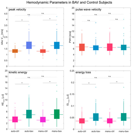 A comparison of hemodynamic parameters between BAV and controls. Boxplots for a group-wise (BAV vs. healthy) comparison of the Vmax, PWV, KE, and EL metrics calculated via automated and manual processing. Automated-processing values are labeled as “auto-” and manual-processing values as “manu-”; healthy subjects’ values are labeled as “ctrl” and BAV as “bav”. The horizontal lines above the boxplots show the t-test comparison results, with “n.s.” for p > 0.05 and “**” for p < 0.005 (no p values were observed in the range between 0.005 and 0.05).