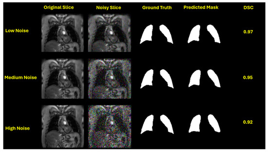 A limitation of this study is that no formal mathematical framework was developed to evaluate the computational robustness or sensitivity of the segmentation models to different types and magnitudes of noise. However, model performance was quantitatively assessed using widely accepted segmentation metrics: DSC, which measures the overlap between predicted and ground truth masks; Avg HD and HD95, which quantify boundary accuracy and the degree of spatial mismatch between segmented regions; and XOR error, which captures the total number of mismatched pixels. These metrics collectively provide a comprehensive assessment of segmentation performance in terms of both region overlap and boundary precision. Future work may benefit from incorporating shape-based or topological analysis frameworks to further elucidate model robustness and segmentation fidelity under challenging imaging conditions.