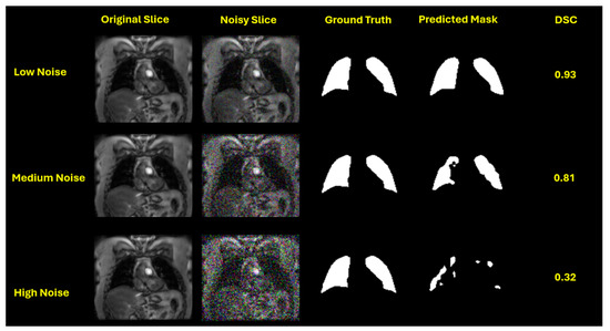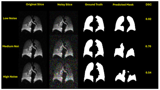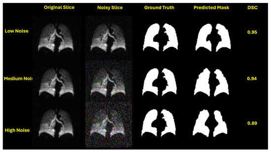 To quantify the level of image degradation introduced by noise, we calculated the average signal-to-noise ratio (SNR) for the central slice across all participants, assuming that the SNR patterns observed in central slices are representative of the entire slice stack. For hyperpolarized gas MRI, under noise-free conditions, the average SNR was 74, indicating excellent image quality. When Gaussian noise with a standard deviation of 0.05 was applied, the SNR dropped to approximately 19. Medium noise (std = 0.15) further reduced the SNR to 9.6, while high noise (std = 0.25) lowered it to 4.5. According to the Rose criterion, an SNR of 5 or greater is generally required for reliable object detectability in noisy images. Notably, the high noise level in our experiments fell below this threshold, providing a meaningful scenario to test the robustness of segmentation models under clinically challenging conditions.