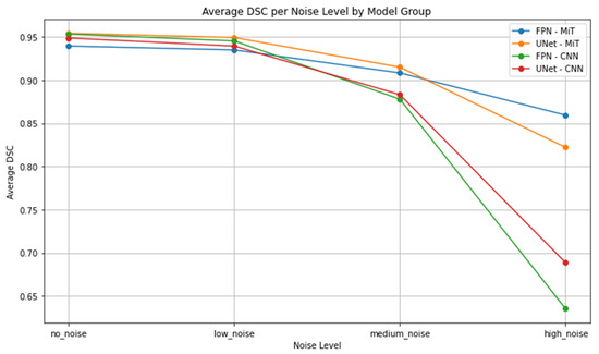 Figures S39, S40, S47, S48, S55, S56, S63 and S64 in Supplementary Materials summarize the segmentation performance under high noise (std = 0.25), where ViT-based architectures demonstrate enhanced stability over CNN-based alternatives.