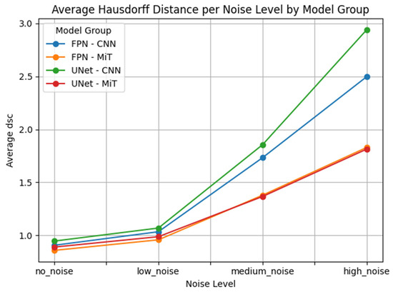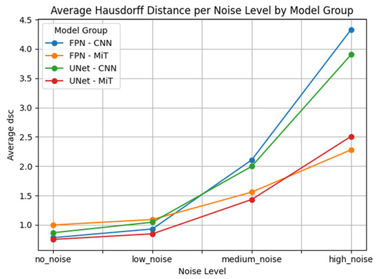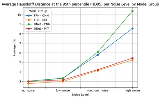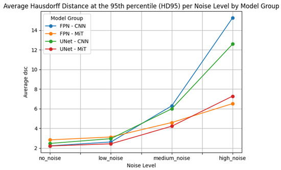 Similar trends were observed in the U-Net architecture. UNet_mit_b5 and UNet_mit_b3 again showed superior performance, with significantly lower error metrics compared to their CNN-based counterparts. UNet_resnet152, UNet_vgg19, and UNet_vgg16 demonstrated severe degradation, especially in boundary-sensitive metrics like HD95, where large outlier values indicated the models’ failure to localize structures accurately under noise.