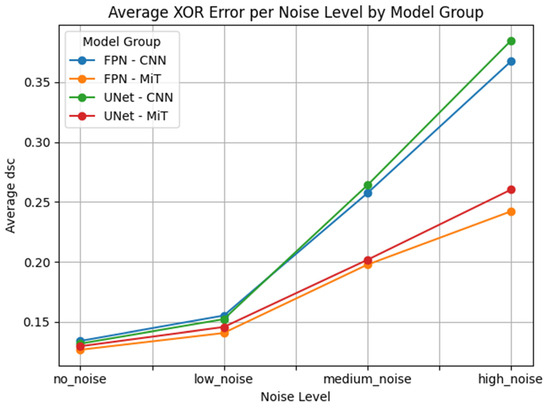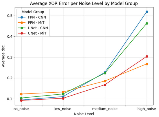 For the FPN architecture, the transformer-based models, particularly FPN_mit_b5, continued to show remarkable robustness. Despite the high noise level, they maintained relatively high segmentation accuracy with less variance in all four evaluation metrics. In contrast, FPN_resnet152, FPN_vgg19, and FPN_vgg16 suffered extreme performance drops. Their Dice coefficients plummeted, and both HD95 and XOR errors increased dramatically, with visibly wider distributions and more frequent outliers, suggesting unstable segmentation outputs.