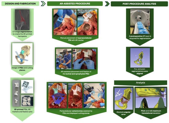 The experimental workflow began with the selection of ten left-sided cadaveric hemipelvis specimens. The workflow was organized into three main phases: (1) the design and fabrication of PSIs and AR markers, (2) the AR-assisted surgical experiment, and (3) post-procedural CT-based evaluation (Figure 2).