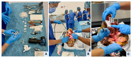 During phase 2, the experiment was carried out by two surgical teams, designated as Team A and Team B. Each team was composed of two surgeons: one experienced surgeon who performed the procedure and one assistant who supported intraoperative tasks. Team A was responsible for the odd-numbered cadavers, while Team B performed the even-numbered cases. In addition to the surgical staff, each team included two engineers: a software engineer and a biomedical engineer. The software engineer supervised the experiment through the display of the HMD on a second laptop screen and provided technical assistance with the AR application and the HoloLens 2 display, while the biomedical engineer managed data collection and experimental evaluation throughout the procedure.