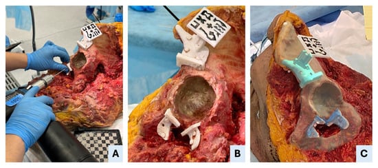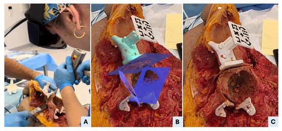 Each procedure began with a standard oncological T-incision for an internal hemipelvectomy approach (Figure 3). Following this, the supraacetabular PSI was manually positioned and fixed, and the AR marker was attached to it (Figure 3). The remaining PSIs were then aligned and fixed using the holographic guidance displayed through the HoloLens 2 (Figure 4). Once all guides were secured, the osteotomies were performed using both the physical PSIs and the superimposed cutting planes for assistance (Figure 5). After completing the resections, the cadavers’ soft tissues were sutured, and the specimens were refrozen. Once frozen, they were mobilized again to perform the postoperative CT scan required for evaluation.