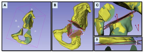 Other investigations, such as those by Sallent et al. and Mediavilla et al., have shown that PSIs improve osteotomy accuracy over freehand techniques, and AR support further enhances this precision [,]. As part of our study group, Iribar-Zabala et al. published a preliminary proof-of-concept assessment for the AR software and workflow used in the present study. Their results demonstrated promising accuracy and positive clinician feedback, reinforcing the precision achievable with AR-guided PSI placement (with an overall mean absolute angular value of 2.20° and a mean distance error of 1.19 ± 0.53 mm) []. In contrast, studies like Hoch et al. observed higher error rates in AR-assisted Ganz pelvic osteotomies, with angular deviations up to 6°–7° and mean distance errors around 9 mm []. Our cadaveric findings reflect a marked improvement over these values. Specifically, we report a mean absolute angular error of 5.11 ± 1.43°, with 86.66% of osteotomies falling within the predefined acceptable angular threshold. Translational accuracy was also favorable, with a mean pitch maximum translational deviation (pMTD) of 4.53 ± 1.32 mm and a roll MTD (rMTD) of 2.79 ± 0.72 mm. Notably, 93.33% of osteotomies met the predefined pitch accuracy criteria, and 100% met roll criteria, further validating the consistency and reliability of the AR-assisted execution. These findings were supported by the Wilcoxon test, which showed significantly lower angular deviation when comparing the executed planes to the AR-displayed planes after PSI placement (p = 0.013, 0.002, and 0.002 for supraacetabular, ischial, and symphysial sites, respectively). This highlights the enhanced precision introduced by the AR in the earlier step of guide placement. Residual error appears to originate mainly from the osteotomy execution phase, influenced not only by AR assistance but also by mechanical factors such as saw stability and surgeon dexterity.