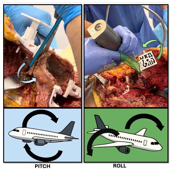 Schematic representation of pitch and roll deviations during osteotomy execution. The top panels show intraoperative examples of potential angular deviations using a surgical saw. (Left) (Pitch): forward or backward tilting of the saw in the sagittal plane, resulting in a change in osteotomy angle relative to the planned trajectory. (Right) (Roll): medial or lateral tilting of the saw in the coronal plane, causing off-axis resection and possible asymmetry. Bottom panels use aircraft analogies to illustrate the same concepts: pitch corresponds to nose-up or nose-down movements, and roll reflects side-to-side wing rotation. These angular deviations are critical parameters in evaluating the precision of AR-assisted bone cuts.