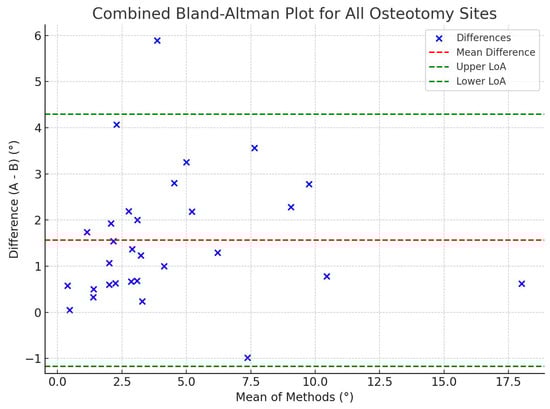 Combined Bland–Altman plot comparing angular deviations from the planned osteotomy plane (A) and the AR-displayed plane after PSI placement (B). The plot shows the mean of the two measurements on the x-axis and their difference (A–B) on the y-axis, combining all anatomical sites (supraacetabular, ischial, and symphysial). The red dashed line represents the mean difference, while the green dashed lines indicate the limits of agreement (±1.96 SD). Most data points fall within the boundaries of agreement, suggesting overall consistency between the two measurements, though Wilcoxon analysis confirmed a statistically significant difference favoring greater precision in B (p < 0.05).