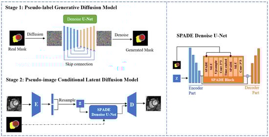 Cardiac mask labels can represent the structure of the heart; therefore, different mask labels can enhance the diversity of cardiac structures. The goal of this phase is to train a pseudo-label diffusion generative model , which takes random sample noise as inputs and generates pseudo-labels , resulting in a pseudo-label dataset , where M is the number of pseudo-labels. This process synthesizes a greater number of label images to be used as conditional labels in the second phase. The label images contain three spatial structural labels of the heart: the left ventricle, the left ventricle myocardium, and the right ventricle, allowing for direct learning of the basic cardiac spatial structure distribution information. This is referred to as the multi-structure label diffusion generative module, which can provide more direct ventricular structure information guidance for subsequent image generation.