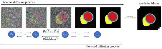 For the sake of conciseness, the true cardiac mask structure is denoted as y, . To maximize data likelihood, the diffusion model defines both forward (also known as generative) and reverse processes, as shown in Figure 2. During the forward process, a small amount of Gaussian noise is sequentially added to the mask y over T steps, following the Equations (3) and (4):