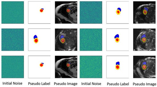 Illustration of the proposed framework’s generative process for cardiac MRI images. The left panel displays the initial noise input. The middle panel shows the generated pseudo-label map, which guides the image synthesis. The right panel presents the final pseudo-image, generated based on the pseudo-label, demonstrating the framework’s ability to produce synthetic cardiac MRI scans.