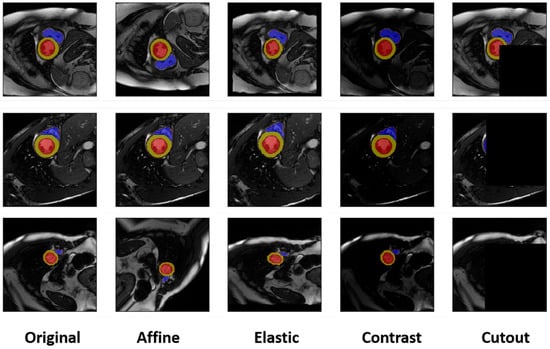 In recent years, segmentation algorithms for cardiac MR images based on deep neural networks (DNNs) have demonstrated remarkable accuracy, establishing state-of-the-art performance [3]. The U-Net [4] segmentation network, as a validated effective DNN, has been extensively utilized in the algorithm models for cardiac MR image segmentation. The authors of [5] developed a fully automatic three-dimensional model based on the 3D U-Net network. The authors of [6] employed the U-Net network to segment three cardiac structures in the short-axis cine sequence and then used an ensemble classifier for the classification and diagnosis of cardiac diseases. The authors of [7] combined the interpretability of the level set method with the U-Net network’s ability to handle more complex images, proposing an automatic medical image segmentation method that integrates constraint terms and the level set method. These methods all leverage the segmentation capabilities of the U-Net network itself and propose new loss functions or combinable feature modules to enhance the model’s segmentation accuracy. However, when the dataset is small and limited, these DNN-based methods may lead to a severe overfitting phenomenon. The difficulty of collecting a large number of annotated medical samples has always been an objective issue in artificial intelligence medical imaging research. Therefore, data augmentation methods are a necessary solution to alleviate the limitation of having few annotated samples in medical datasets.