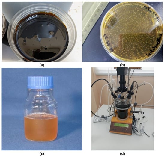 Key materials and equipment used in the fermentation process: (a) Raw sugarcane molasses; (b) Limosilactobacillus fermentum ATCC 9338 strain; (c) Prepared inoculum; (d) LAMBDA MINIFOR biofermentor.