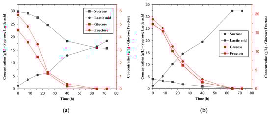 Profiles of sugar consumption during batch fermentation of (a) raw molasses and (b) pretreated molasses with Limosilactobacillus fermentum ATCC 9338 for the production of lactic acid.