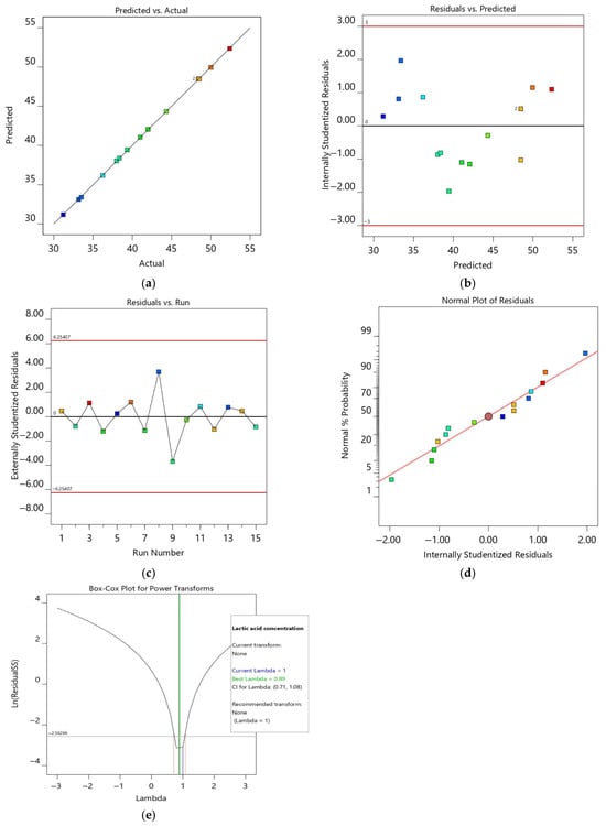 Model diagnostic plots for lactic acid production optimisation: (a) Predicted vs. Actual (b) Residual vs. Predicted (c) Residual vs. Run (d) Normal Probability Plot of Residuals (e) Box–Cox Plot. Colors correspond to individual experimental runs and are used consistently across plots for visual tracking.